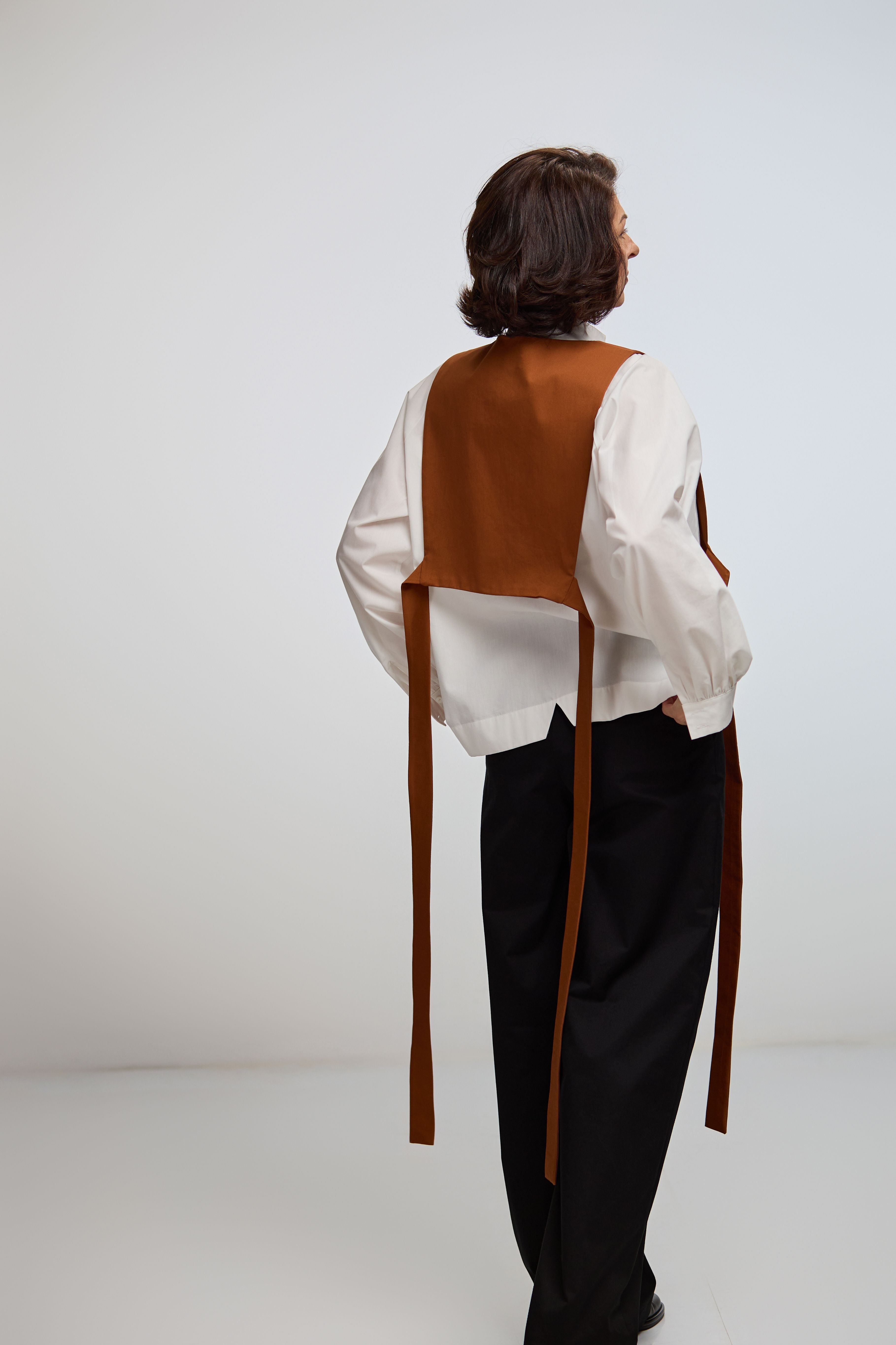Gulerul-vestă IPANOMI din twill de bumbac este un accesoriu vestimentar gândit pentru femeile care își construiesc garderoba cu sens. În nuanța caldă de teracotă, această piesă adaugă structură, profunzime și personalitate ținutelor tale, fără volum inutil.